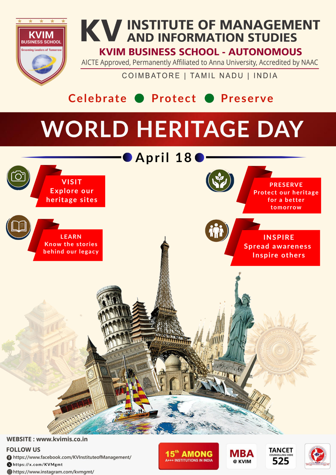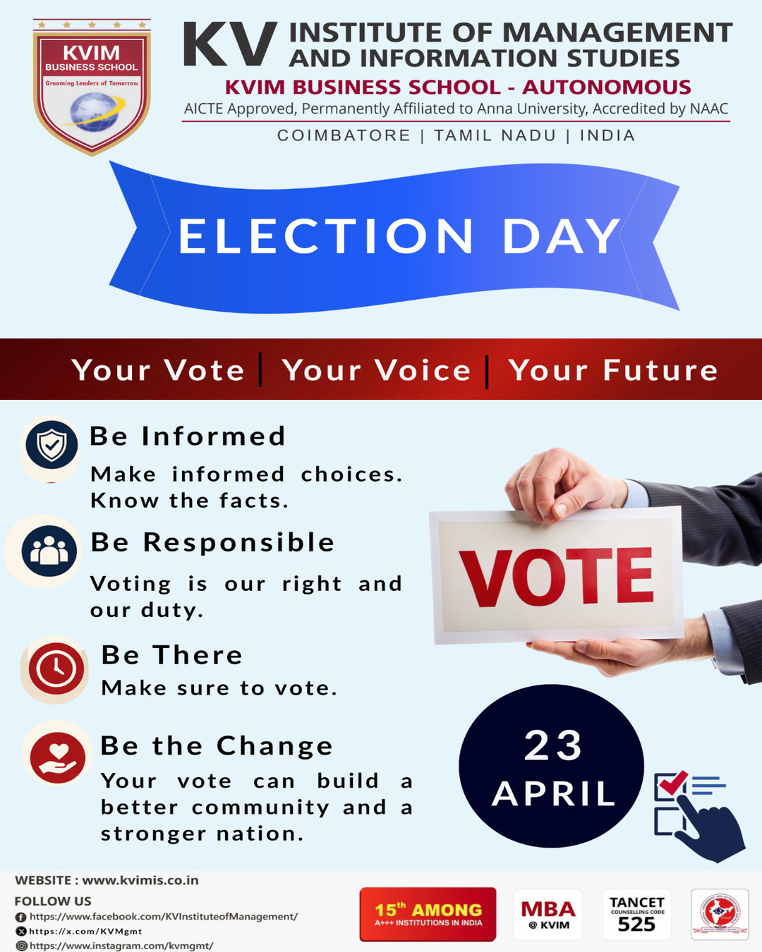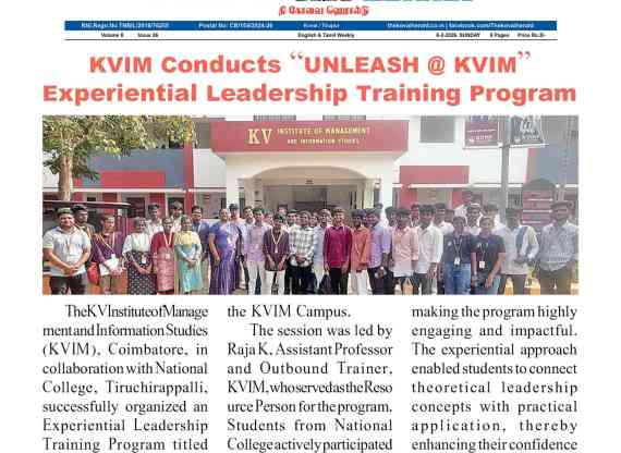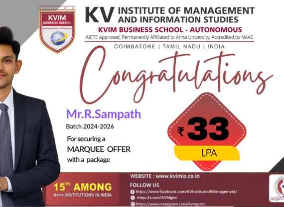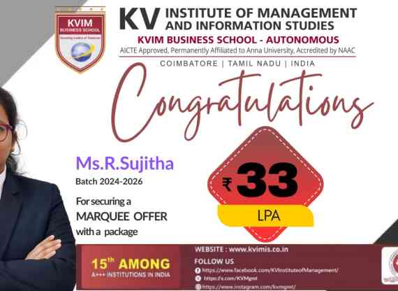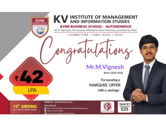 KV Charitable trust came into existence in the year 2000 with an aim to provide the best education to the students. The first initiative was the setting up of KV Matriculation School (located at 546 Sathy Main Road, Kurumbapalayam, Coimbatore Tamil Nadu) with the objective of providing quality and affordable education for the students of Coimbatore district. The KV Charitable Trust approved the opening of KV Institute of Management and Information Studies (KVIM as a standalone B School) during the year 2008.